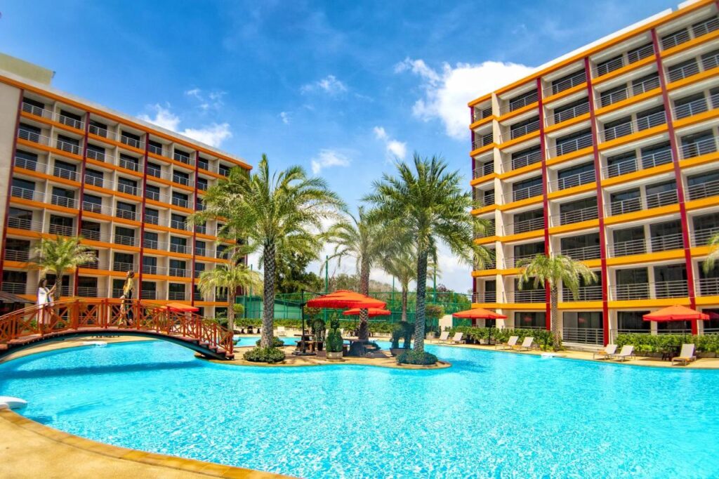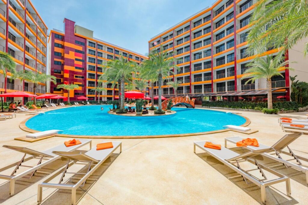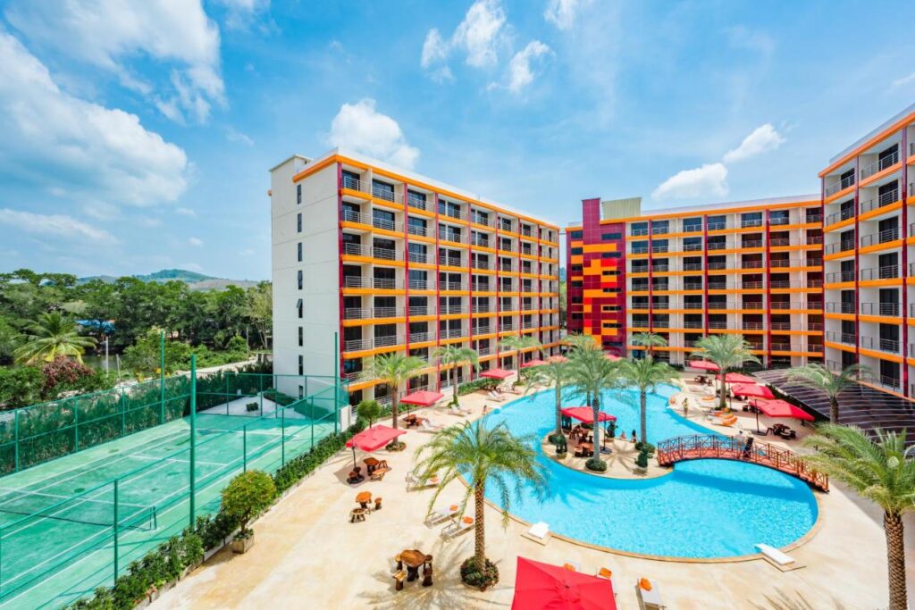 777 Beach Condominium consists of four modern eight-story buildings with 777 apartments, featuring panoramic windows, bright interiors, and balconies overlooking the pool or mountains.